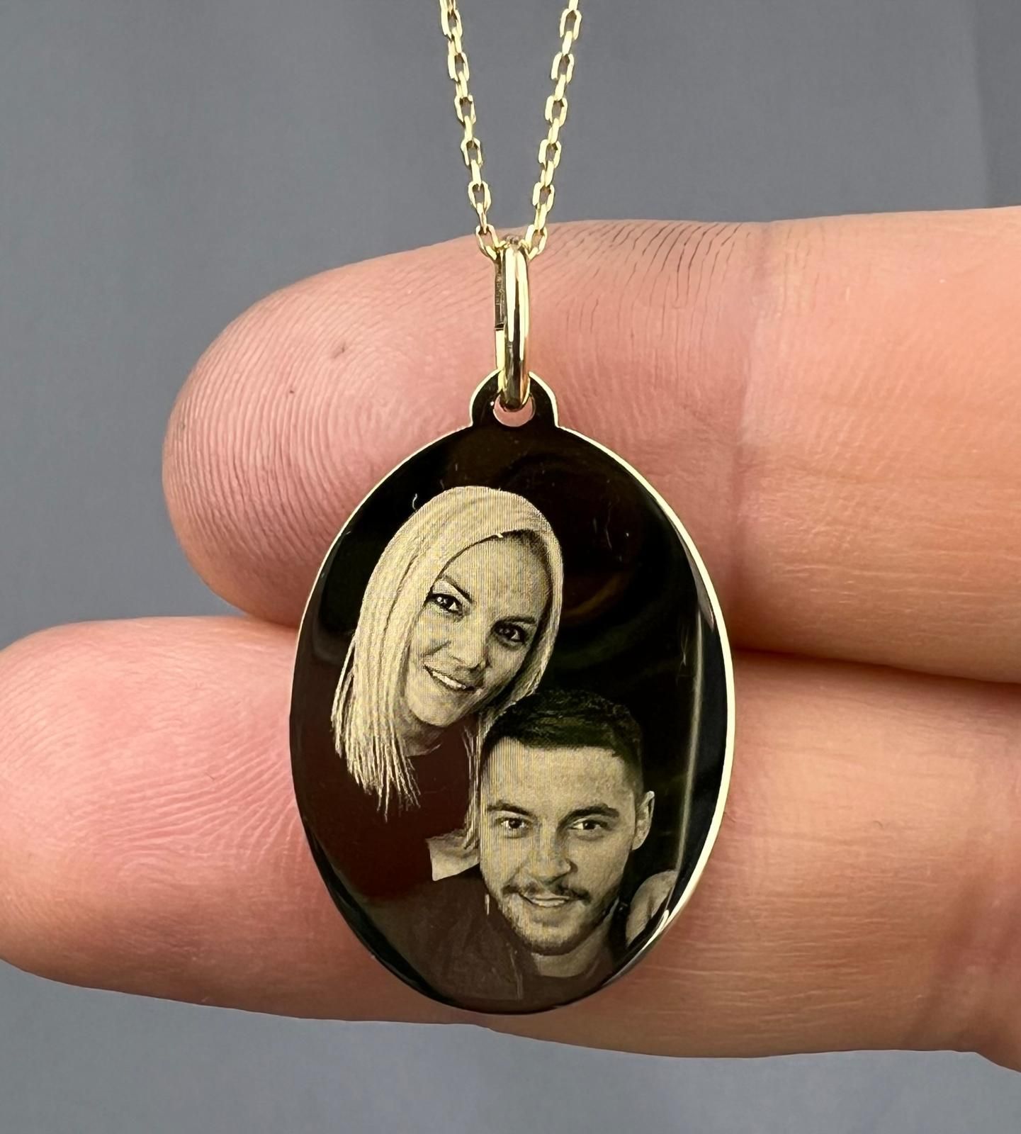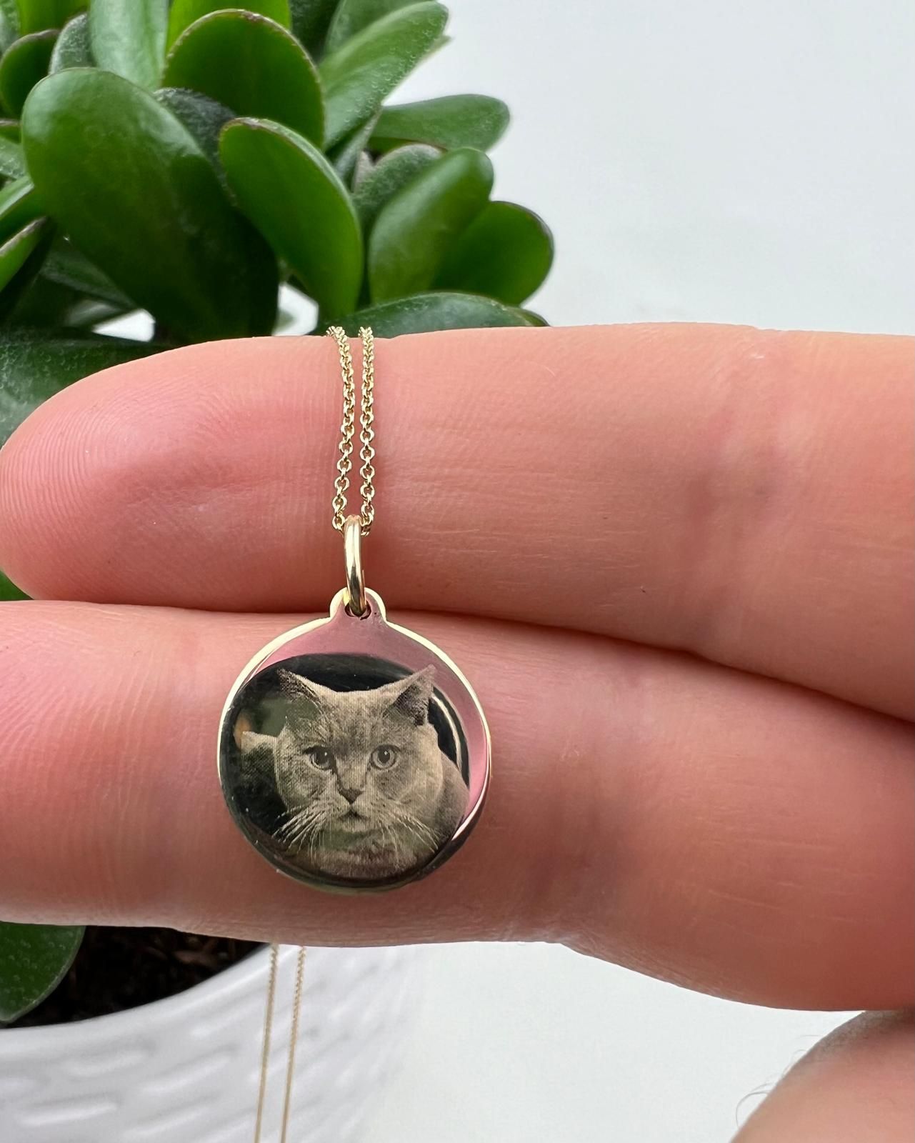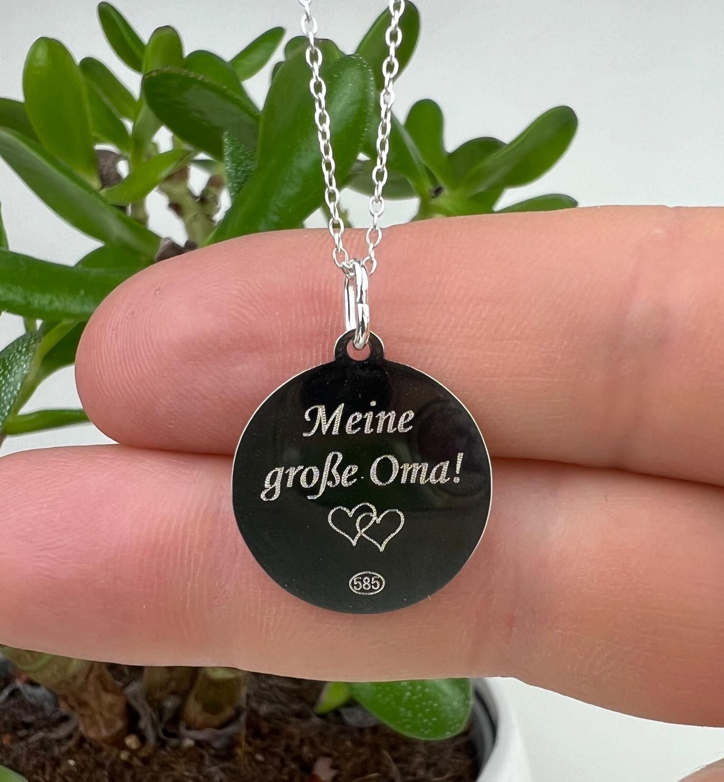 Der "Silas" Anhänger aus 14k Gold bietet die Möglichkeit, das Bild eines geliebten Verstorbenen zu gravieren und so ein Licht in dunklen Zeiten zu sein. Als edles Schmuckstück dient er als ständiger Begleiter und spendet Trost in der Trauer.