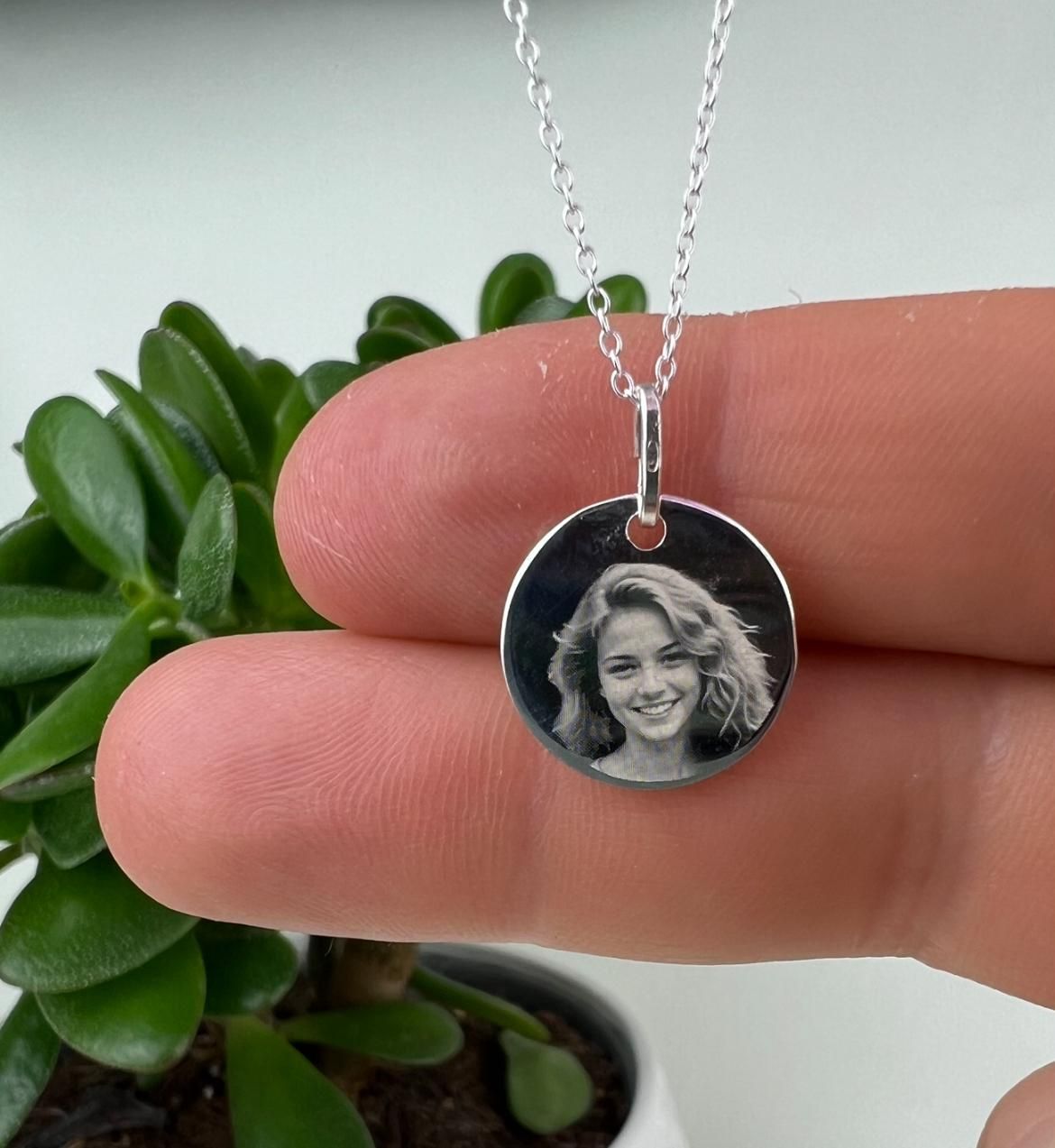 Ein eleganter Anhänger aus 925 Sterling Silber (2cm x 1,3 cm), der Erinnerungen stilvoll bewahrt. Ideal für die Gravur eines besonderen Fotos – z. B. eines geliebten Menschen, der nicht mehr bei uns ist.